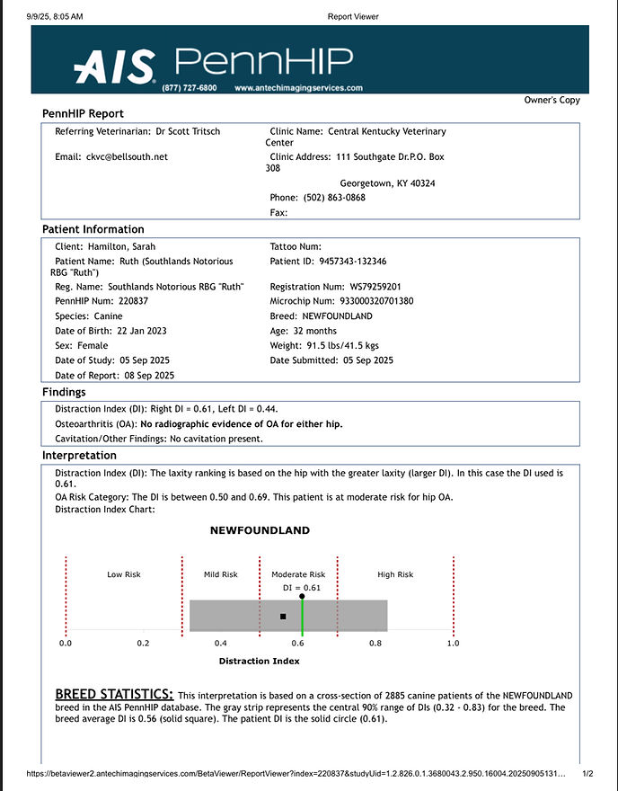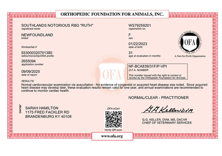 Though Grade 1, Ruth is in the normal range of elbow acceptability for this breed. She is well rounded and there are no signs of genetic predisposition in her heritage. She Comes from a line of quality "Normal' rated newfoundlands and is a great candidate in our program. She is matched with studs with higher results to correct any possible transfer and has produced quality puppies in the past!